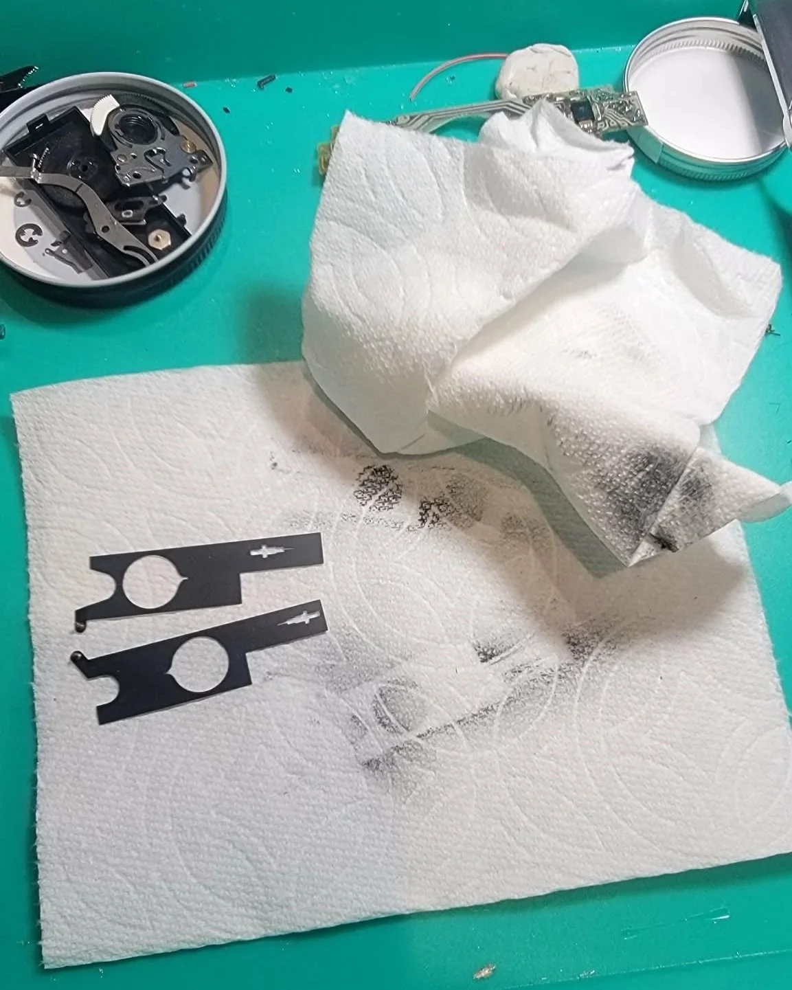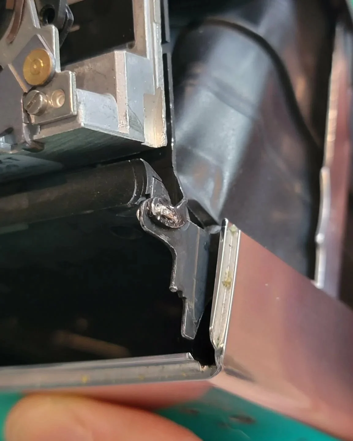 I then also replaced the short cover with a replacement; and also created a very tiny cotter pin of sorts to act in place of the missing hinge pin (finding an actual replacement would have been very difficult; would have needed a very short <1mm long and <1mm diameter rivet).